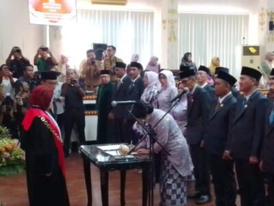 “Pertama undang-undang nomor 23 tahun 2014 tentang Pemerintahan daerah sebagaimana diubah terakhir dengan undang-undang undang-undang nomor 6 tahun 2023. Kedua, Peraturan Pemerintah nomor 12 tahun tentang pedoman penyusunan tata tertib Dewan Perwakilan Rakyat daerah provinsi kabupaten dan kota,” ucap Ade, saat membaca isi naskah pelantikan.