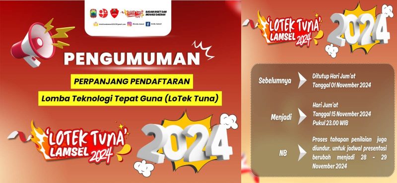 Selamat Membaca | Pengumuman Perpanjangan Pendaftaran Lomba Teknologi Tepat Guna Tahun 2024Pengumuman Perpanjangan Pendaftaran Lomba Teknologi Tepat Guna Tahun 2024 Redaksi1 November 20242 November 2024Lampung Selatan, Pemerintahan Download pengumuman selengkapnya dapat diunduh pada berkas berikut: PERPANJANGAN MASA PENDAFTARAN LOMBA TEKNOLOGI TEPAT GUNA KABUPATEN LAMPUNG SELATAN (LOTEK TUNA LAMSEL) TAHUN 2024 Dilihat: 196 Tag:lamsel sebelumnyaASB South dan South East Asia Bakal Gelar Project Pasti Lanjutan di Kecamatan SidomulyoselanjutnyaJelang Peringatan Hari Pahlawan, PIKK PLN Gelar Bakti Sosial dan Kunjungi Purnakarya PLN Sang Pejuang Kelistrikan