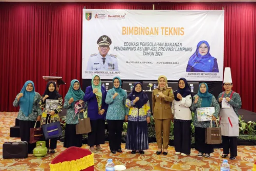 BANDAR LAMPUNG – Pj. Ketua TP PKK Provinsi Lampung Ibu Maidawati Retnoningsih Samsudin membuka Bimbingan Teknis Pengolahan Makanan Pendamping ASI (MPASI), di Ballrom Hotel Horison, Bandarlampung, Selasa, (05/11/2024).
