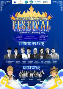 Bandar Lampung – Universitas Lampung (Unila) akan menyelenggarakan acara bertajuk “Anugerah Be Strong Festival Kebudayaan dan Cinta Tanah Air Universitas Lampung 2025”, yang akan berlangsung pada Kamis, 16 Januari 2025, di Gedung Serbaguna Unila, mulai pukul 13.00 WIB hingga 21.00 WIB.
