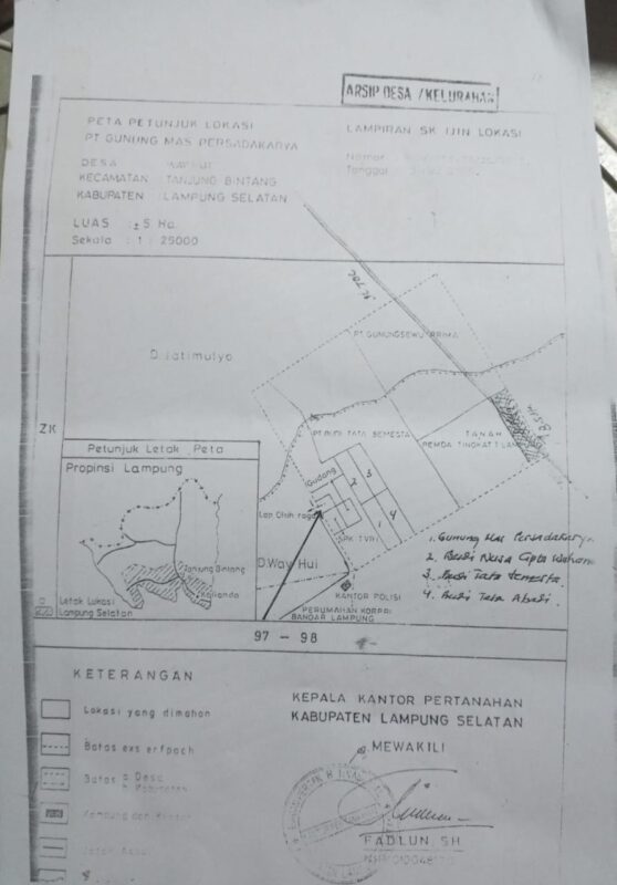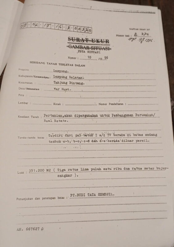 M. Yani menjelaskan, bahwa tanah tersebut memang saat ini memiliki status HGB (Hak Guna Bangunan) yang dikuasai oleh PT Budi Tata Semesta (BTS), anak perusahaan dari PT Bumi Waras (BW). Akan tetapi berdasarkan Ijin Lokasi Nomor: 400/KPLS.79/IL/1996, Tertanggal 3 Mei 1996 dan peta resmi dari Badan Pertanahan Nasional (BPN) Kabupaten Lampung Selatan, batas-batas tanah HGB sudah jelas bahwa fasum diluar daripada Sertifikat HGB dari PT. BTS. Namun, muncul peta baru dengan Sertifikat HGB Nomor: 370, Tertanggal 28 Agustus 1996 dari PT. BTS yang menyebutkan bahwa fasilitas umum, seperti lapangan sepak bola dan tanah pemakaman umum di wilayah tersebut, berada di dalam klaim kepemilikan PT BTS.