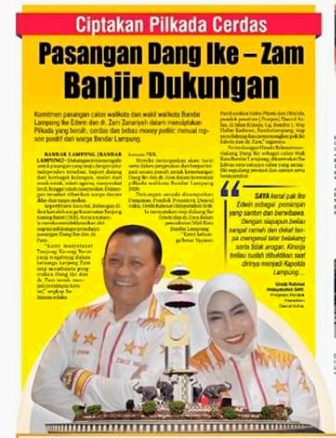 “Itu jaminan saya dan dr Zam yang akan menjaga keamanan Bandar Lampung jadi kota teraman Se-Indonesia,” demikian Ike Edwin yang saat jadi Kapolda Lampung menorehkan banyak prestasi antara lain menurunkan tingkat peredaran narkoba daerah setempat dari nomor 6 menjadi urutan 16 nasional.